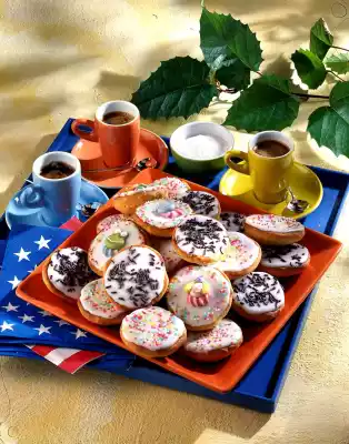 Coat the flat side of the Americans with the cast. Sprinkle with small sugar pearls and chocolate sprinkles and decorate with sugar figures. Let it dry. Results in about 25 pieces.