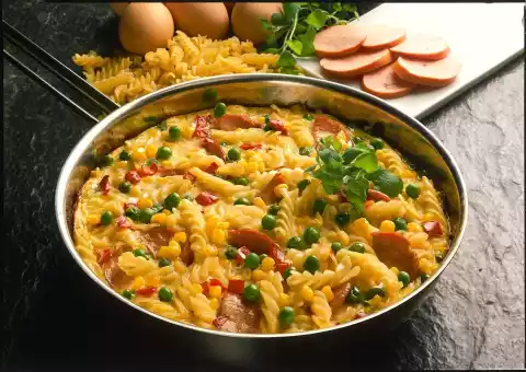 Add paprika, corn and peas and steam briefly. Drain and fold in the pasta. Wash the chives and chop finely, except for a little bit for garnishing. Whisk eggs and milk. Season with salt, pepper and nutmeg.