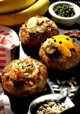 Cut the dough in thirds. Dice banana. Knead into the first portion of banana cubes, grated coconut and chilli powder. Dice the apricots. Knead into the second portion of apricots, crushed peppercorns and curry.
