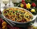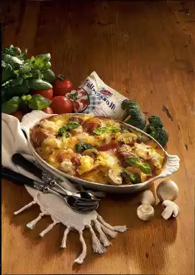Spread all ingredients in a greased casserole dish (approx. 30 cm long). Whisk eggs and milk. Peel garlic, press it through a press into the egg milk, season with salt, pepper and nutmeg.