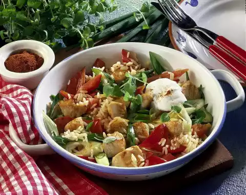 Cook the rice in 100 ml boiling salted water for about 15 minutes. Clean, wash and chop the peppers and spring onions. Wash turkey, dab dry and cut into cubes.
