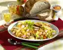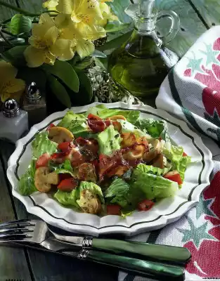 Wash, clean and slice the mushrooms. Cut the bacon into pieces, put them in a pan and take them out crispy. Fry the mushrooms in the bacon fat. Clean, wash and cut salad into strips.
