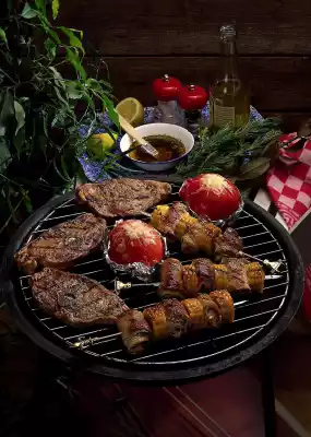 Grill the skewers on the hot grill for about 10 minutes, turning occasionally. Lamb chops approx. 2 minutes on each side. Serve with tomatoes grilled in aluminium foil, seasoned with pepper and parmesan.