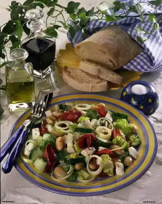 Mix into the salad together with the salami slices. Serve with Italian baguette.