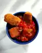 Mix vinegar, mustard, salt, pepper and sugar well. Whip the oil into the mixture. Peel onion and chop roughly. Clean and wash the radicchio and romaine lettuce and cut into strips. Wash the tomatoes and cut into slices.