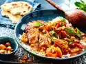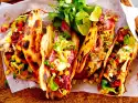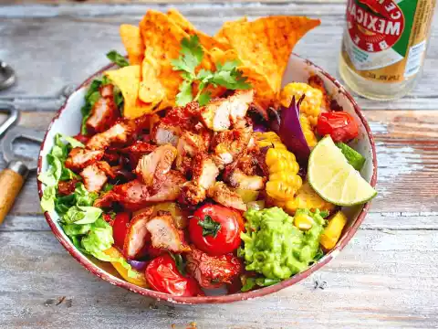 Cut the meat around the skewers into thin strips. Serve with salad, vegetables, guacamole and tortilla chips. Sprinkle with coriander mix and garnish with lime wedges.