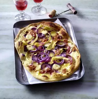 manufacturer) bake for about 15 minutes until golden brown. Take the tarte flambée out of the oven. In the meantime prepare the 2nd tarte flambée and bake it as well.
