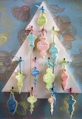 Cut a hole with a punched spout so that the cookies can be hung up later. Put the cookies on 4 baking trays lined with baking paper. Bake in the preheated oven (electric cooker: 200 °C/ convection oven: 175 °C/ gas: level 3) for about 10 minutes. Remove from the oven and let the cookies cool down on a cake rack. Mix icing sugar, egg white and lemon juice to a sugar icing. Quarter the icing. Colour 1/4 each of the icing with red, blue and green food colouring. Pour white icing into a piping bag. Cut the blue icing in half again. Colour one half slightly darker and fill 1 teaspoon of icing into piping bag. Spread the cookies with the coloured icing and let them dry.