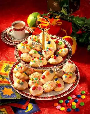 Remove the cookies from the oven and let them cool down on a cake rack. In the meantime, stir icing sugar and 3-4 tablespoons of water until smooth, brush the cookies with it and decorate with chocolate lentils, love beads and coloured sugar beads.