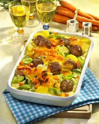 Put meatballs on top. Spread slices of processed cheese on the casserole. Bake the casserole in a preheated oven (electric cooker: 225 °C/ convection oven: 200 °C/ gas: level 4) for approx. 30 minutes. Garnish with chives.