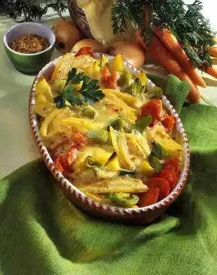Pour sauce over the vegetables and sprinkle with cheese. Bake in the preheated oven (electric cooker: 200 °C/ gas: level 3) for approx. 30 minutes.