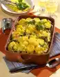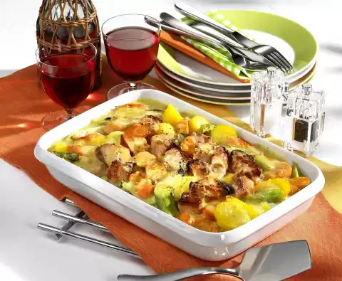 Add to the carrot sauce 5 minutes before the end of the cooking time. Add the potatoes to the carrot-leek sauce, season with salt and pepper. Put the vegetables in an ovenproof dish and spread the slices of pork on top. Sprinkle with cheese and bake in a preheated oven (electric range: 200 °C/ convection oven: 175 °C/ gas: level 3) for 20-25 minutes.