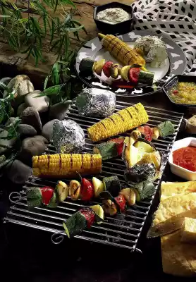 Wash the potatoes, wrap in aluminium foil and cook in the embers of the grill for about 1 hour. Clean the corn cobs and boil them in salted water for 20 minutes, drain them and grill them on the hot barbecue, turning several times for about 15 minutes. Clean, wash and chop the zucchinis. Clean the mushrooms, wash and quarter the tomatoes.