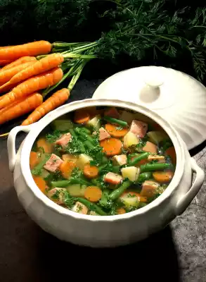 Wash cured pork. Bring 1 litre of water and clear broth to the boil. Add the meat and cook over a low heat for about 15 minutes. In the meantime, peel and wash the potatoes and carrots. Dice the potatoes and cut the carrots into slices. Remove the smoked pork loin from the stock.