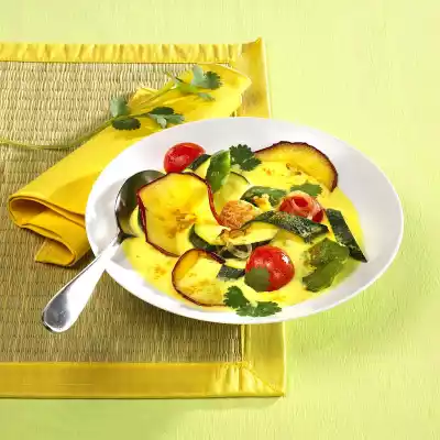 Sauté onion in it until transparent. Add paprika and fry for about 2 minutes. Remove the bell pepper and onion from the pan and put aside. Steam apple slices in frying fat for about 2 minutes. Season with cardamon and turmeric. Deglaze with stock and apple juice. Add paprika, onions and zucchini. Stir cream cheese into the liquid. Season to taste with salt and pepper. Wash and halve the tomatoes and add to the stew.