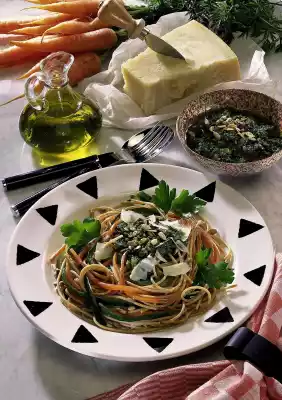 Peel and wash the carrots. Clean and wash the cucumber. Cut the vegetables lengthwise into slices. Cook spaghetti in plenty of boiling salted water for 12-15 minutes until al dente. Add the vegetable sticks about 3 minutes before the end of the cooking time and cook with them.