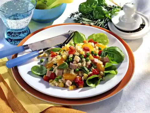 Cook the pasta in boiling broth for about 8 minutes, then drain. Rinse and drain the Mexican vegetables. Also drain mandarins. Keep 3 tablespoons of juice. Cut turkey into small cubes. Mix the prepared ingredients. Mix vinegar and tangerine juice for the marinade.