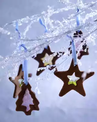 Cut out the middle of the Christmas trees with a small cookie cutter (4.5 x 2.5 cm) and the middle of the stars with a small star (2.5 cm). The resulting frame should be at least 1 cm wide. Using a pallet, place the biscuits on a baking tray lined with baking paper. Make 1 hole in each cookie in a suitable place with the back of a pointed brush. Place some candy crumbs in the middle of each cookie and bake in the preheated oven In the preheated oven (electric cooker: 150 °C/ convection oven: 125 °C/ gas: level 1) for 8-10 minutes one after the other. Remove the cookies and let them cool down. Carefully pierce the cookie holes again with a toothpick, thread a ribbon through them and hang them up