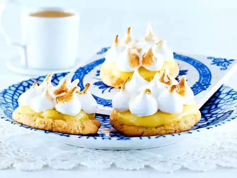 Just before serving, beat the egg whites until stiff, adding 180 g of sugar. Finally add 1 teaspoon of lemon juice. Continue beating until a firm, shiny mass is formed. Pour into a piping bag with a large perforated spout and squirt small tips onto the tartlets.