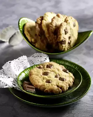 Using a tablespoon, place 6 piles of dough (1 heaped tablespoon each) on 3-4 baking trays lined with baking paper and press flat. Sprinkle the rest of the chocolate on the cookies. Bake the trays one after the other in a preheated oven (electric cooker: 200 °C/ convection oven: 175 °C/ gas: level 3) for 10-12 minutes. Remove from the baking tray, place on a cake rack and allow to cool