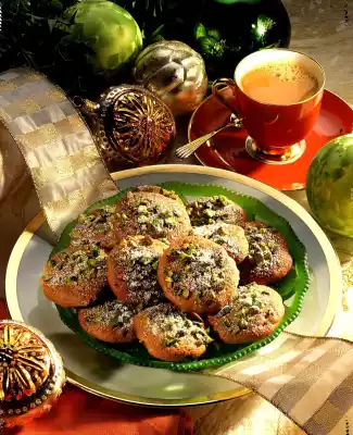 Press the piles a little bit flat, sprinkle with the pistachios and press if necessary. Bake the trays one after the other in a preheated oven (electric: 200 °C/ gas: level 3) for about 12 minutes. Place the finished cookies on a cake rack and let them cool down.