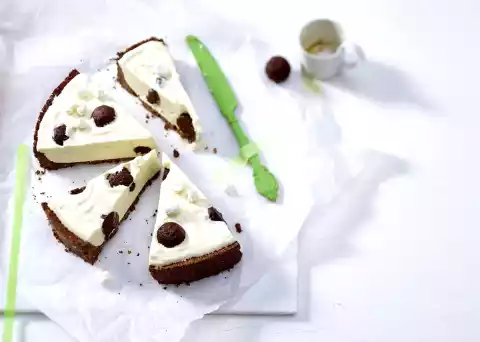 In the meantime, form approx. 15 balls from the date mass and chill again. Whip the cream with the whisks of the mixer until stiff and fold into the marshmallow cream. Smooth the cream on the biscuit base, spread the chocolate balls evenly on the surface and press them in to different depths.