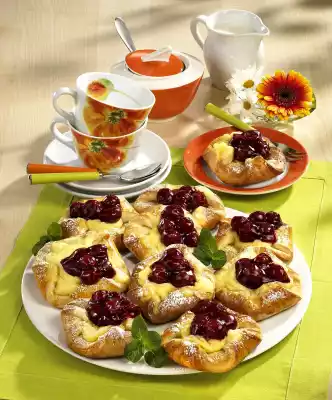 Pour into a bowl, cover with cling film and let cool. Drain the cherries. Mix red fruit jelly powder with 6 tablespoons of cherry juice. Bring the rest of the cherry juice and 1 tablespoon of sugar to the boil, stir in the red fruit jelly powder, bring to the boil and stir in the cherries. Cover with cling film and let cool off. Roll out the puff pastry into a rectangle (30 x 40 cm) and cut into 12 pieces (10 x 10 cm). Fold each corner towards the middle. Fill 1 tablespoon of pudding into each centre. Put Copenhagen on a baking tray lined with baking paper. Mix egg yolk with cream. Coat the edges of the dough with it. Bake in the preheated oven (electric cooker: 175 °C/ convection oven: 150 °C/ gas: level 2) for 20-25 minutes. Take out and let cool down. Spread the stewed cherries over the Copenhageners. Dust with icing sugar and decorate with mint