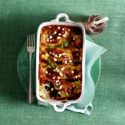 Heat 1 teaspoon of oil in a frying pan, sauté the shallot in it until translucent, add the garlic and spinach and pour on the stock. Season spinach with salt, pepper and nutmeg, mix with 1 teaspoon of cheese. Fill the cannelloni with one teaspoon of filling. Put the cannelloni in a small casserole dish, pour tomato sauce over them. Spread the remaining cottage cheese over it. Bake in the preheated oven (electric cooker: 200 °C/ convection oven: 175 °C/ gas: level 3) for about 20 minutes and garnish with the remaining marjoram