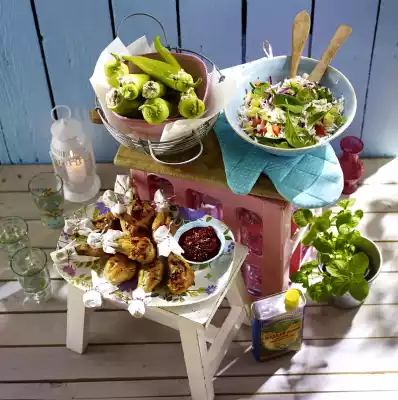 Fill into the peppers and put the lids back on. Arrange in a bowl.