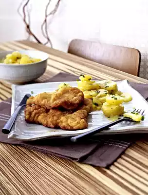 Wash the meat, dab dry, flatten slightly, cut in half crosswise and season with salt and pepper. Whisk eggs. Turn escalopes one after the other in flour, egg and breadcrumbs. Heat 125 g clarified butter in 2 pans. Fry escalopes in portions for about 6 minutes while turning. While doing so, carefully toss in hot fat. Arrange schnitzel and potato salad and garnish with lemon slices
