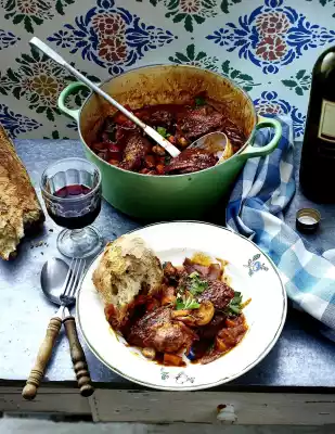 Pour in wine and stock. Add the chicken pieces and thyme, season again with salt and pepper, cover and braise over medium heat for 45-50 minutes.