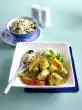 Dab aubergine slices dry with kitchen paper and fry in hot frying fat with garlic and shallots while turning. Add the chicken pieces and deglaze with 1/4 litre of water and red wine. Cover and braise for 40 minutes at medium heat.