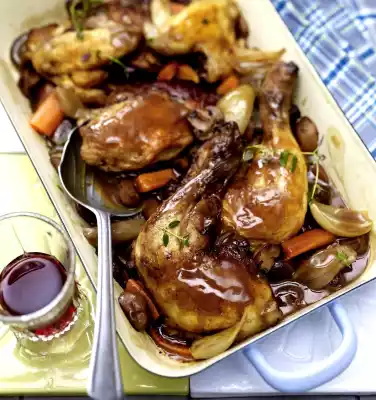 Pour in wine and stock. Add chicken pieces and thyme, except for something to garnish. Season with salt and pepper, cover and braise over medium heat for 45-50 minutes. Remove the meat.