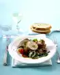 Pour sauce through a sieve into a pot, bring to the boil, thicken with sauce thickener and season with salt, pepper and 1 pinch of sugar. Put the vegetables and meat back into the roaster, pour the sauce over them and garnish with thyme.