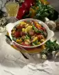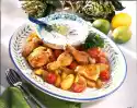 Clean and clean the mushrooms and halve them according to size. Wash, dry and halve lemon. Wash chicken, dab dry and cut into 8 pieces. Mix oil with salt and pepper. Spread chicken parts with it. Peel garlic and press it through a garlic press. Mix vegetables, garlic, some salt and laurel. Put everything into the watered Roman pot and put the chicken parts on top. Pour the broth and wine and put it covered on the grid in the cold oven.