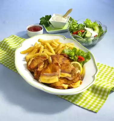 Wash the meat, dab dry and season with salt and pepper. Cover 4 escalopes with 1 slice of cheese and ham each. Cover with a 2nd schnitzel. Whisk the egg in a deep dish. Turn the schnitzel first in flour, then in egg and finally in breadcrumbs.
