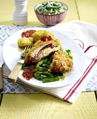 Cut the cheese into slices. Wash the meat, pat dry, beat flat between 2 layers of foil. Place cutlets side by side on a work surface. Season top with salt and pepper. Cover with 2 slices of sausage each. Put some cheese on each half of the cutlets. Fold the cutlets over and stick together with 1-2 wooden skewers. Halve the remaining sausage slices