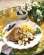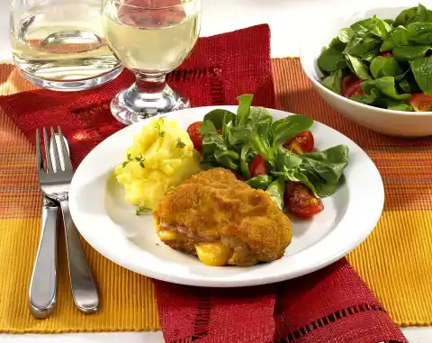 Season with salt and nutmeg and keep warm. Heat the oil in a pan. Fry the escalopes for 4-5 minutes on each side. Mix salad and cherry tomatoes with salad dressing. Arrange cordon bleu with mashed potatoes and salad on plates.