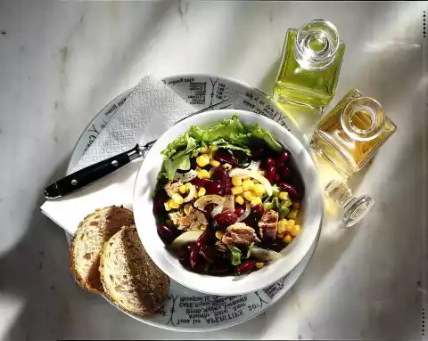 Drain the tuna and corn. Peel and chop the onion. Mix oil and vinegar. Season with salt and pepper. Mix tuna, corn beans and onions with the vinaigrette.