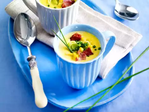 Drain on kitchen paper. Finely puree the soup, season to taste with salt, pepper and nutmeg. Add the remaining leek and boiled ham and leave to stand for 3-4 minutes. Arrange soup in cups. Garnish with chives and corn.
