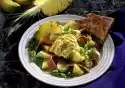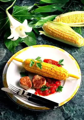 Season with salt and pepper, remove and keep warm. Sauté the tomatoes and chilli in the frying fat. Add ketchup, bring to the boil briefly. Season to taste with salt and pepper if necessary. Arrange corn, steaks and sauce garnished with parsley on plates.
