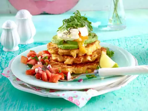 Beat 4 eggs one after the other in the boiling, no longer boiling vinegar water. Cook for about 4 minutes, carefully lift them out and let them drip off on kitchen paper. Arrange 3 corn pancakes on plates to form turrets, add some salsa.