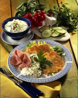 Heat clarified butter in a pan and bake 3 buffers of the potato dough in the pan one after the other. In the meantime, wash the cucumber and cut into cubes. Clean and wash the radishes and cut them into sticks.