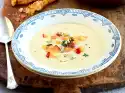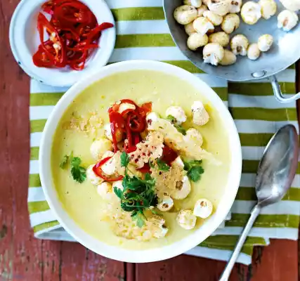 Finely puree the corn soup with a hand blender, mixing in the crème fraîche. Season to taste with salt and pepper. Break the Parmesan cheese plate into pieces. Wash the coriander and shake dry. Pluck the leaves and arrange them on the soup with pepperoni.