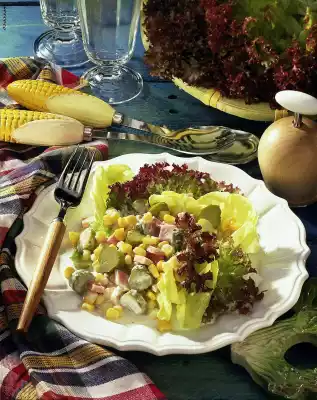Rinse the corn and let it drain. Cut cucumber into slices, ham into strips. Mix corn, cucumber slices, ham, mayonnaise and cucumber water. Season with salt and pepper. Wash lettuce leaves, pluck into bite-sized pieces and divide into 4 plates. Arrange corn and ham salad on top