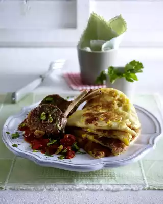 Bake from both sides until golden brown. From the remaining dough bake another 3 pancakes. Wash the meat, dab dry and season with salt and pepper. Heat 1 tablespoon of oil in a pan. Fry the lamb chops for about 6 minutes, turning them over.