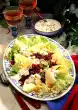 Season with salt, pepper, sugar and vinegar and spread over the salad. Garnish with apple slices as desired.