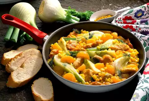 Carefully fold in the mandarins. Serve the corn pan garnished with some fennel green. Serve with baguette bread or grainy rice.