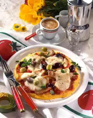 Bring 1/4 litre of salt water and fat to the boil. Sprinkle in semolina and bring to the boil again while stirring. Let it swell for about 15 minutes at low heat while stirring occasionally. In the meantime, wash the cutlets, dab dry and fry them in hot oil on both sides for about 3 minutes. Season with salt and pepper. Take out and cut into pieces. Drain mozzarella and cut into slices. Form semolina dough on a baking tray lined with baking paper into a circle (approx. 22 cm Ø) and spread with tomato paste. Spread meat and olives on top. Place mozzarella slices on top. Sprinkle with oregano and bake in a preheated oven (electric: 200 °C/ gas: level 3) for approx. 25 minutes