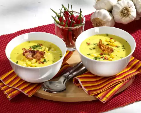 Stir in the corn and parsley that have been put aside. Serve the soup with a slice of bacon in four bowls.
